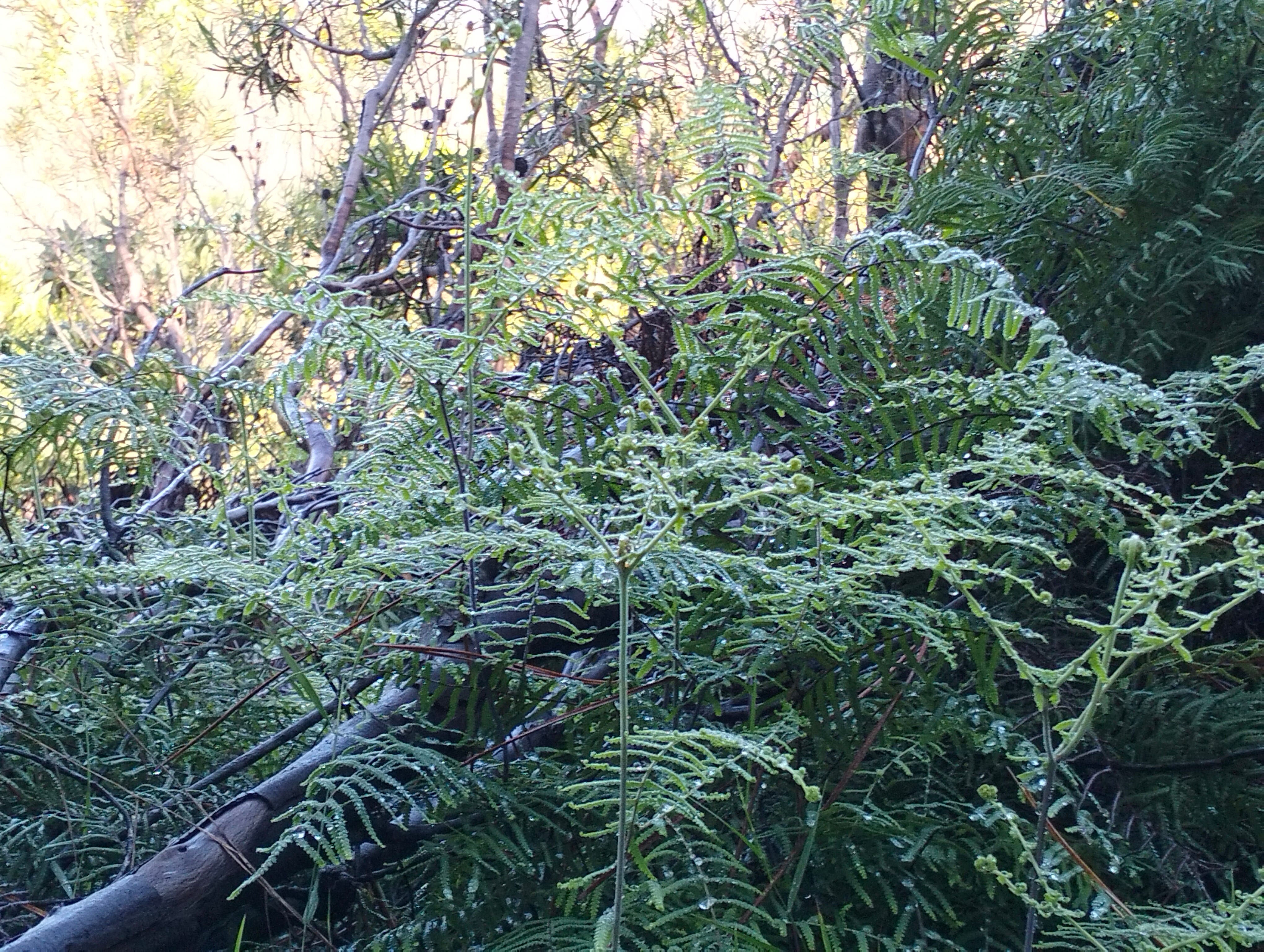 At the edge of the green there are drier ferns, the familiar bracken: also European invaders, less headline-worthy than wattle and pine perhaps, and able to grow where the softer indigenous ferns won’t go, so everyone’s happy, unless they get too thick and prevent the usual organic unfolding. So many stories that could be told. So many landscapes too: after a crystal clear dive into the river on the fourth day, we rise up to a fynbos forest. Fat king proteas appear from nowhere like giants’ cherries. The delicate fynbos trees shade us sweetly from the afternoon heat before we descend into the magic of Heuningbos. Perhaps there are honeybush plants in here; there is certainly honey, and there are bees, and rippling streams, and echoes of the ancient ones.